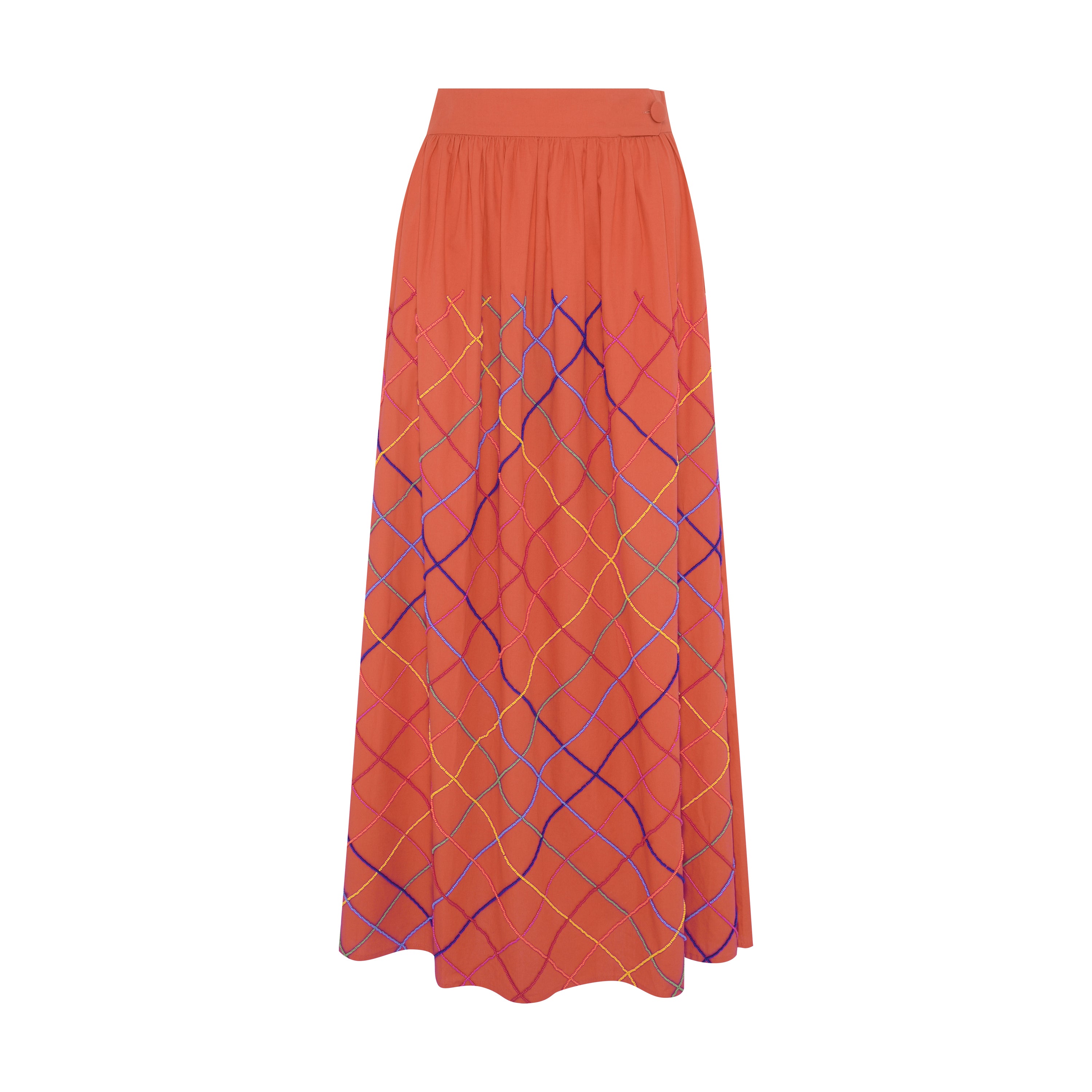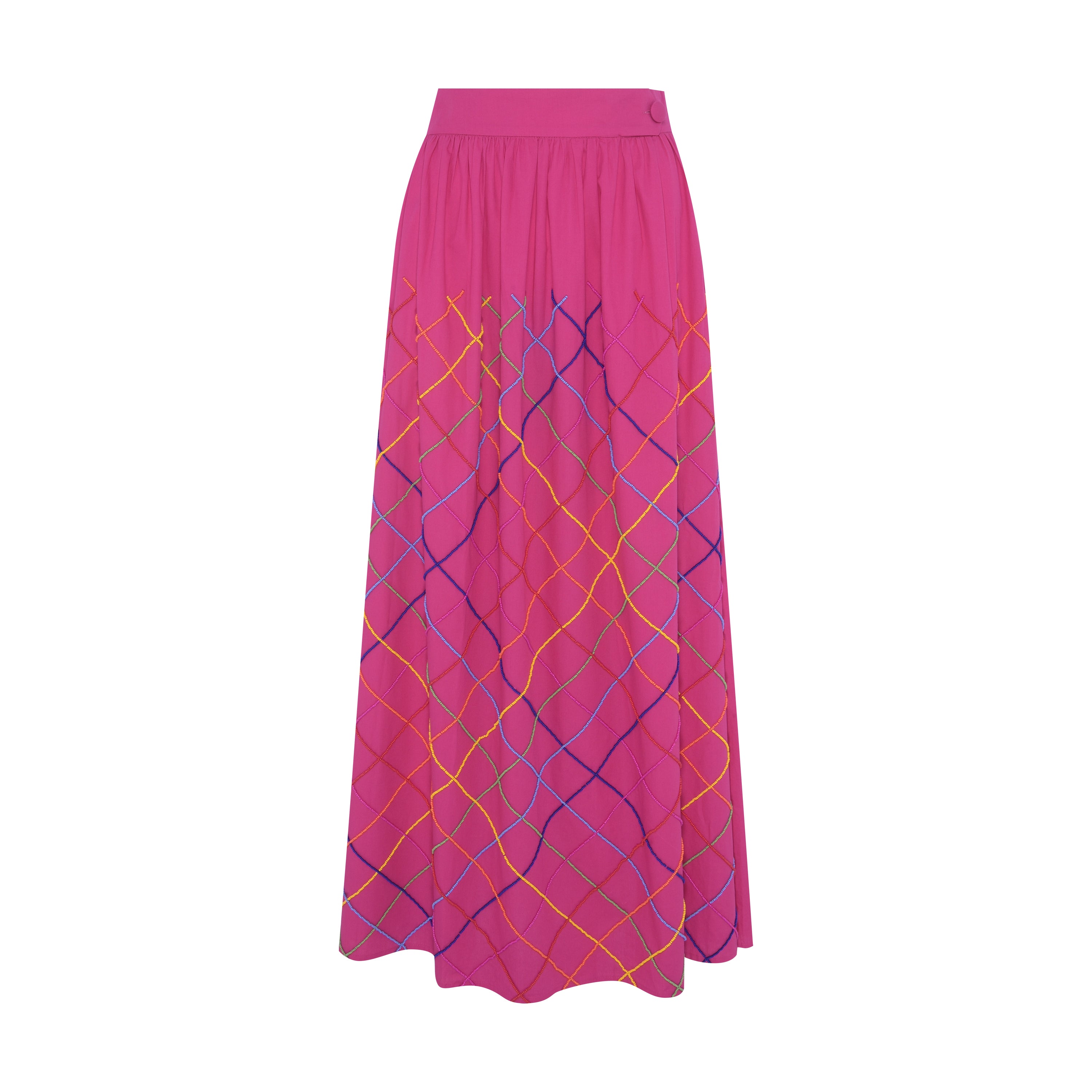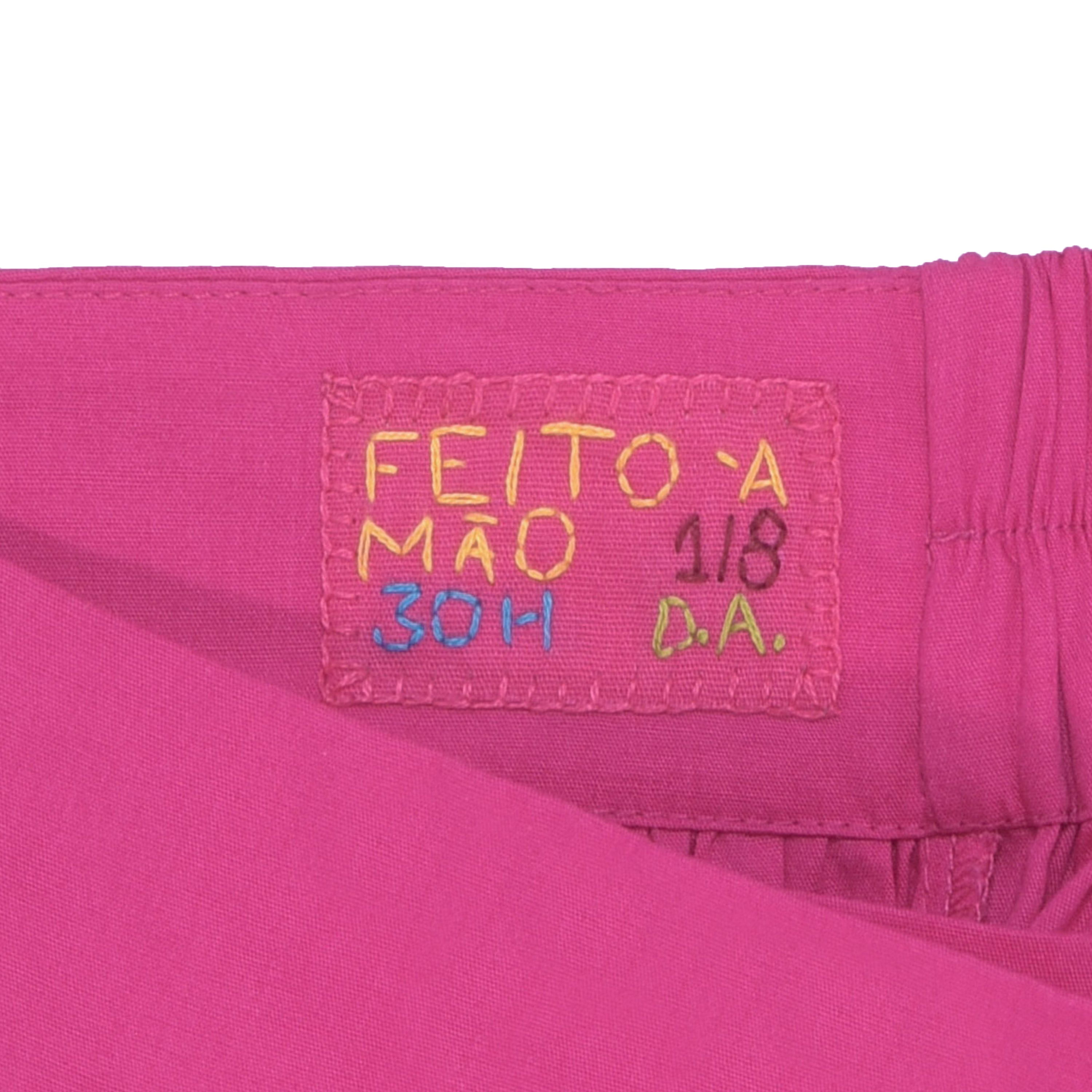 A saia possui um abotoamento frontal com botão forrado no mesmo tecido e um elástico na parte traseira do cós, garantindo ajuste perfeito e conforto. O bordado manual exclusivo de mais de 30 horas, em miçangas multicoloridas adiciona um toque moderno e sofisticado ao look.