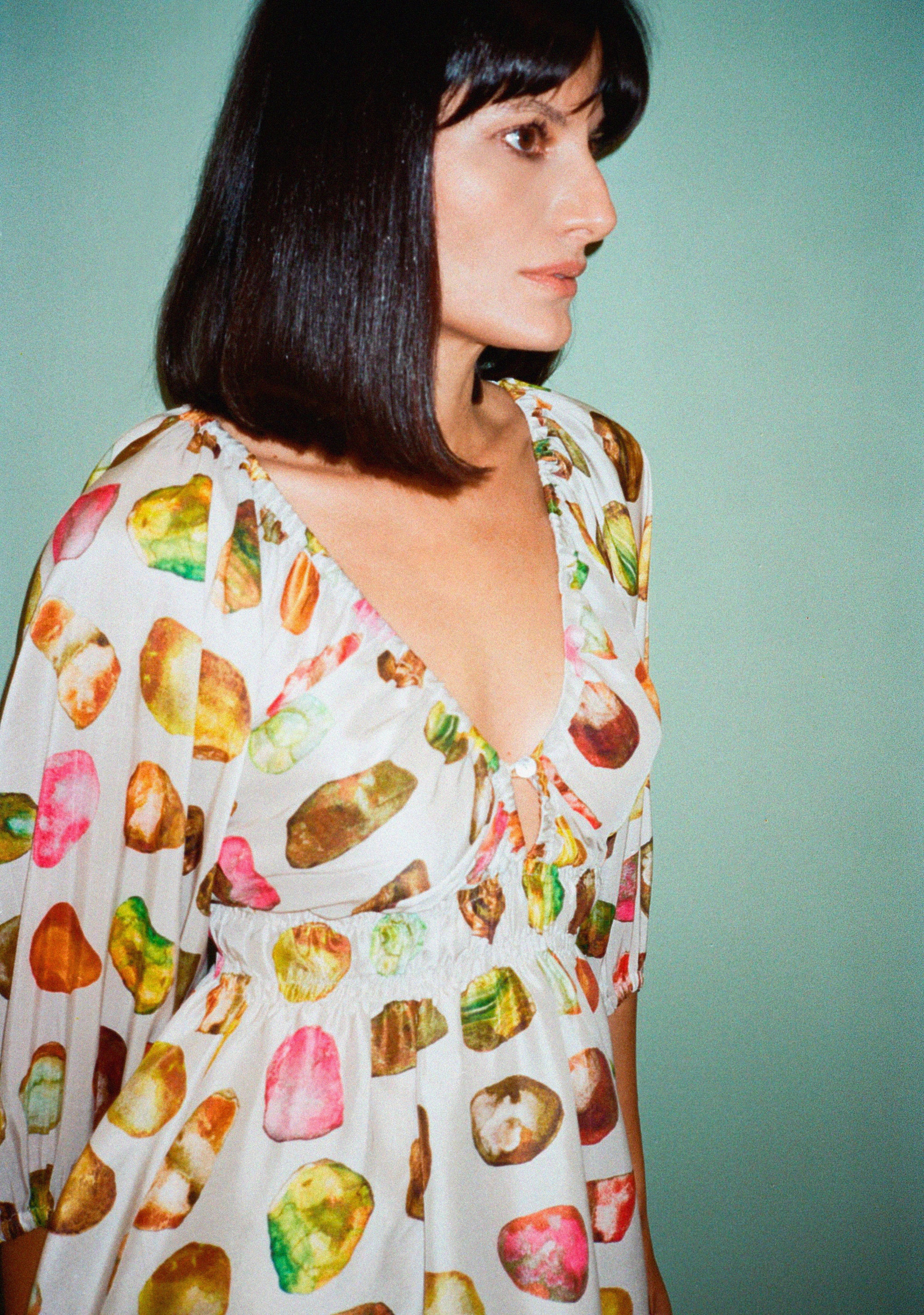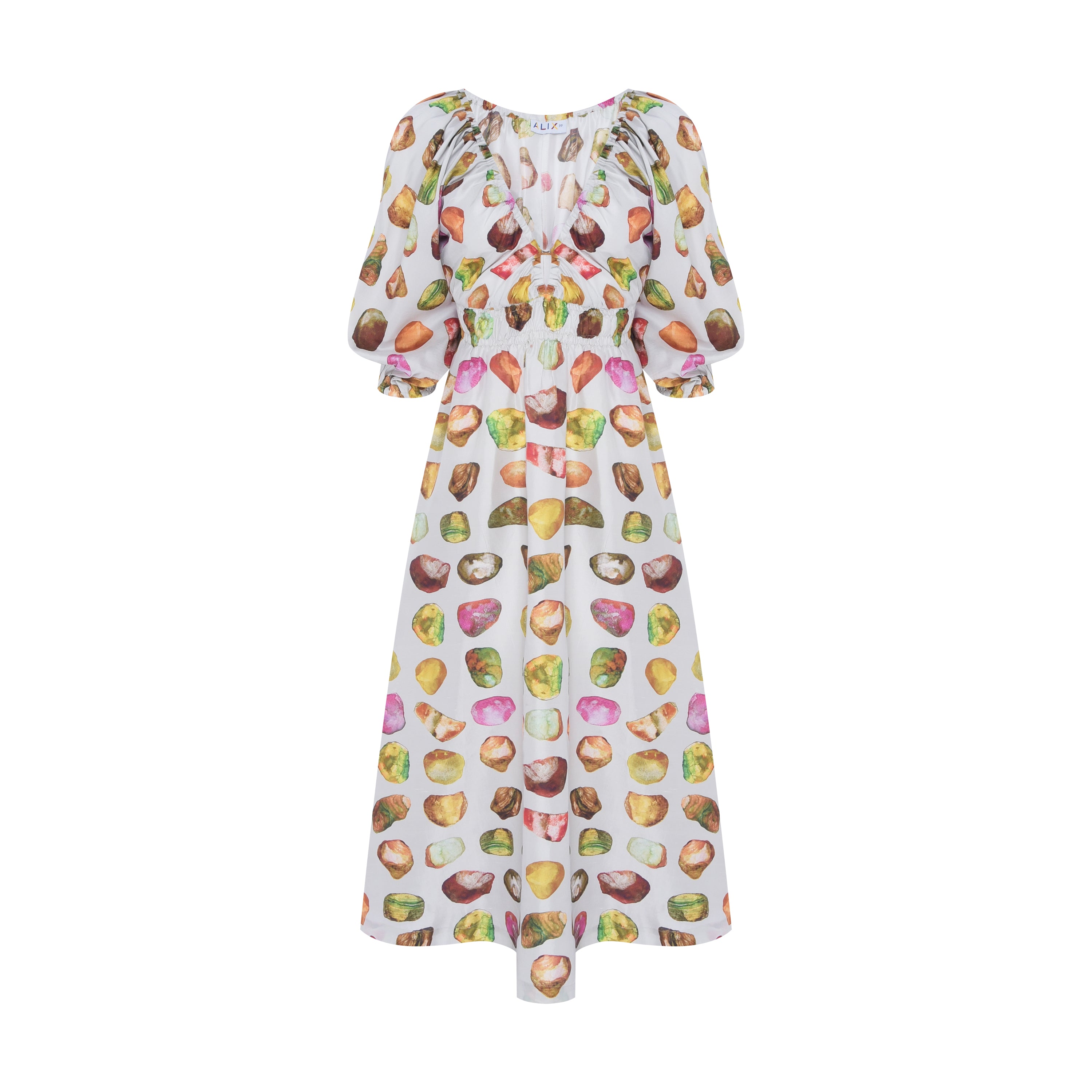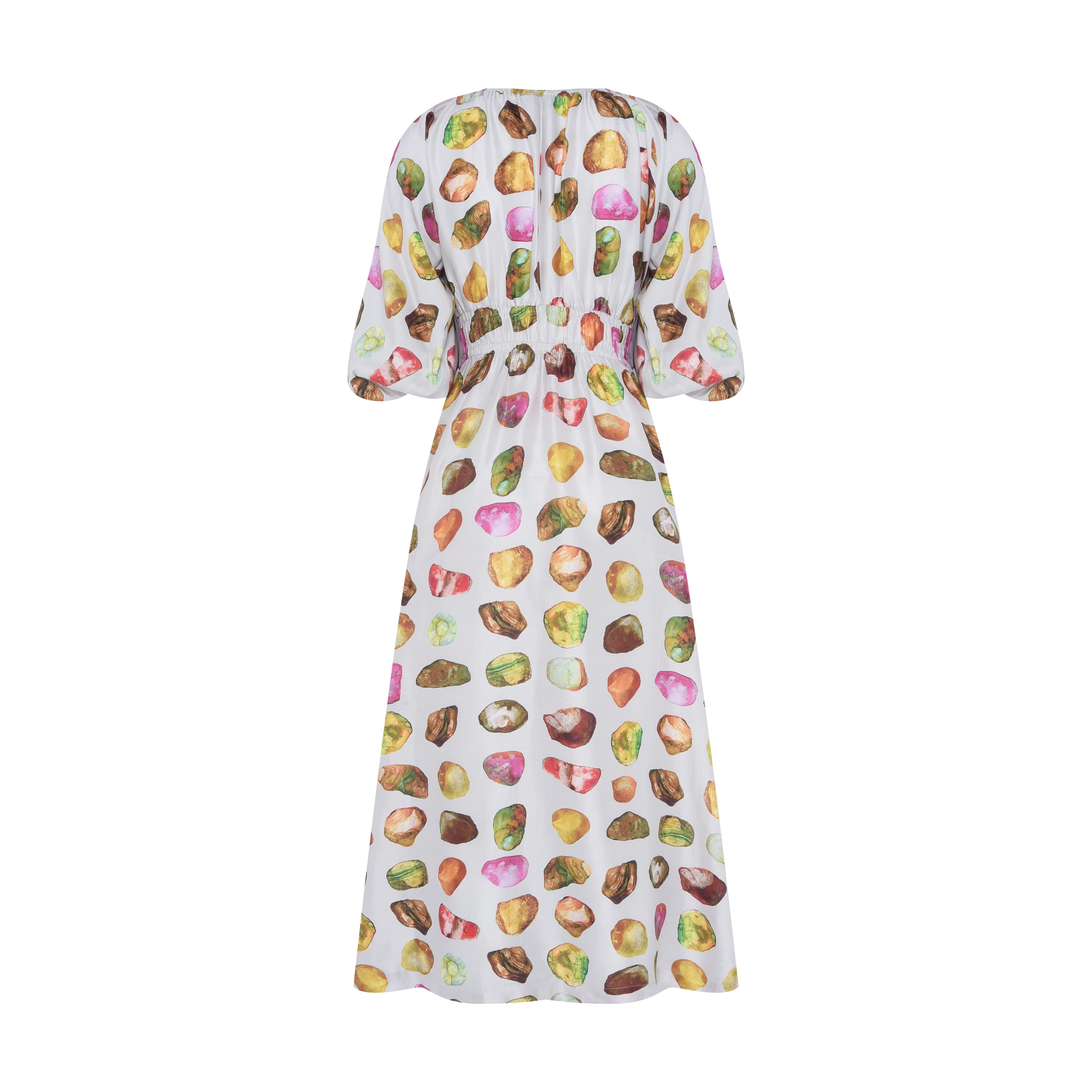 O Vestido Maysa Pedraria em shantung de seda pura é uma peça sofisticada que combina a estampa exclusiva com um design despojado.